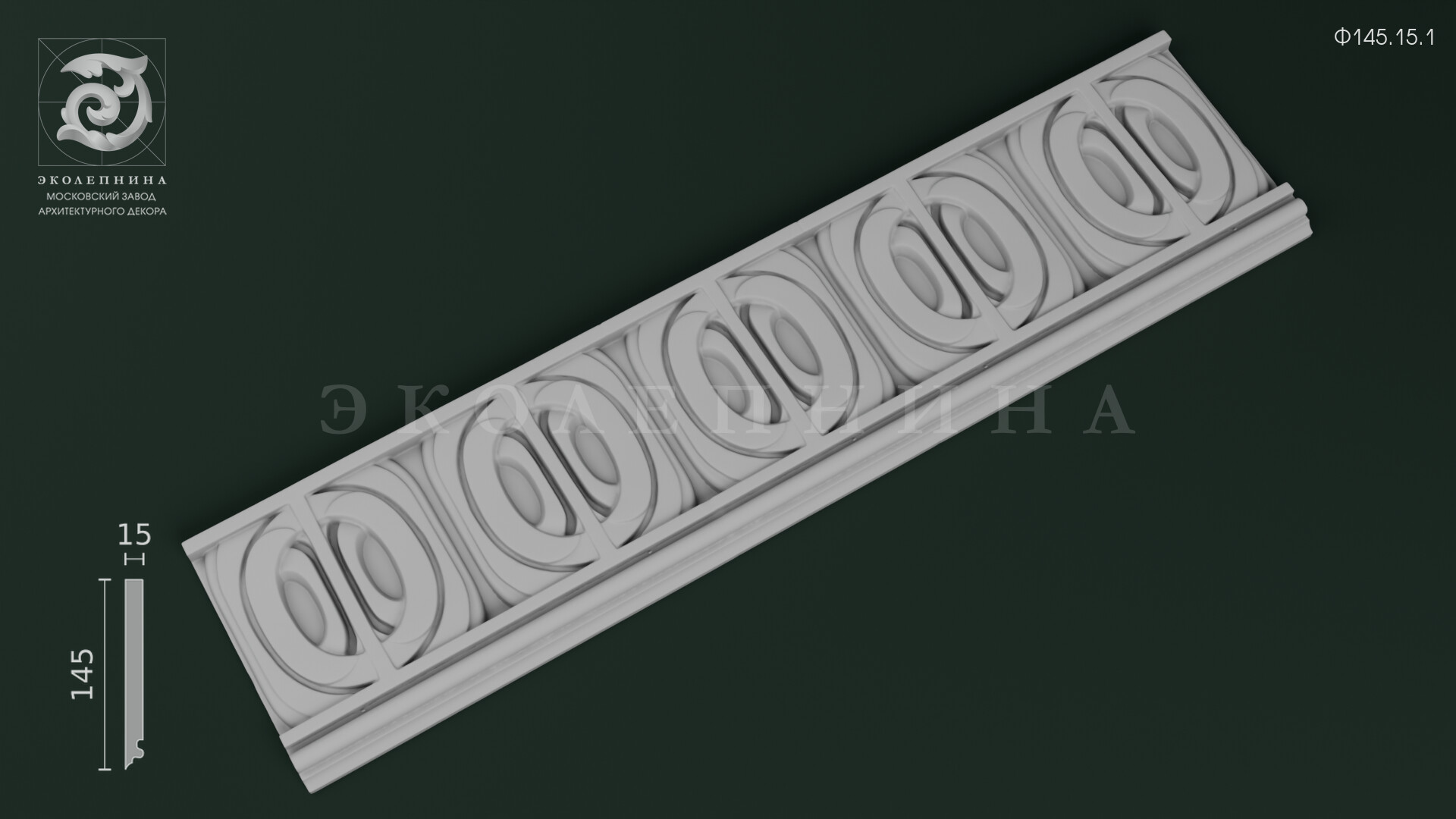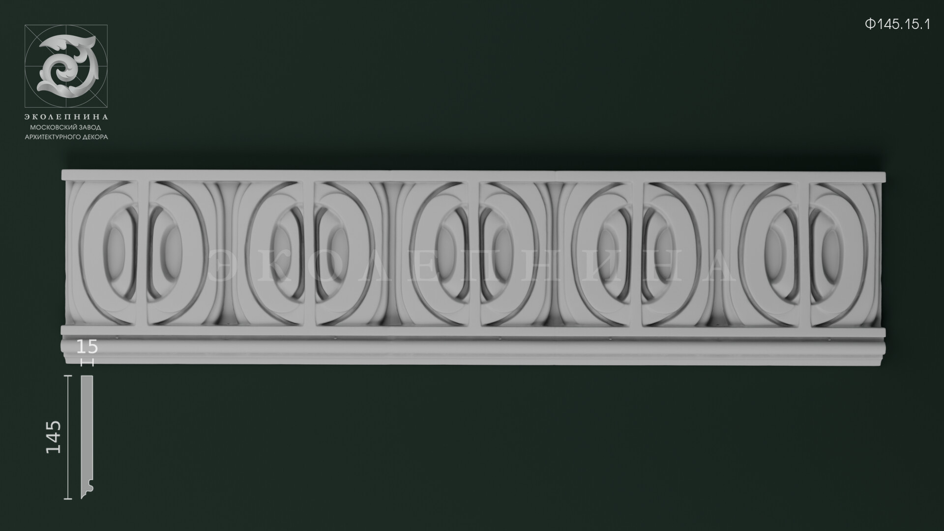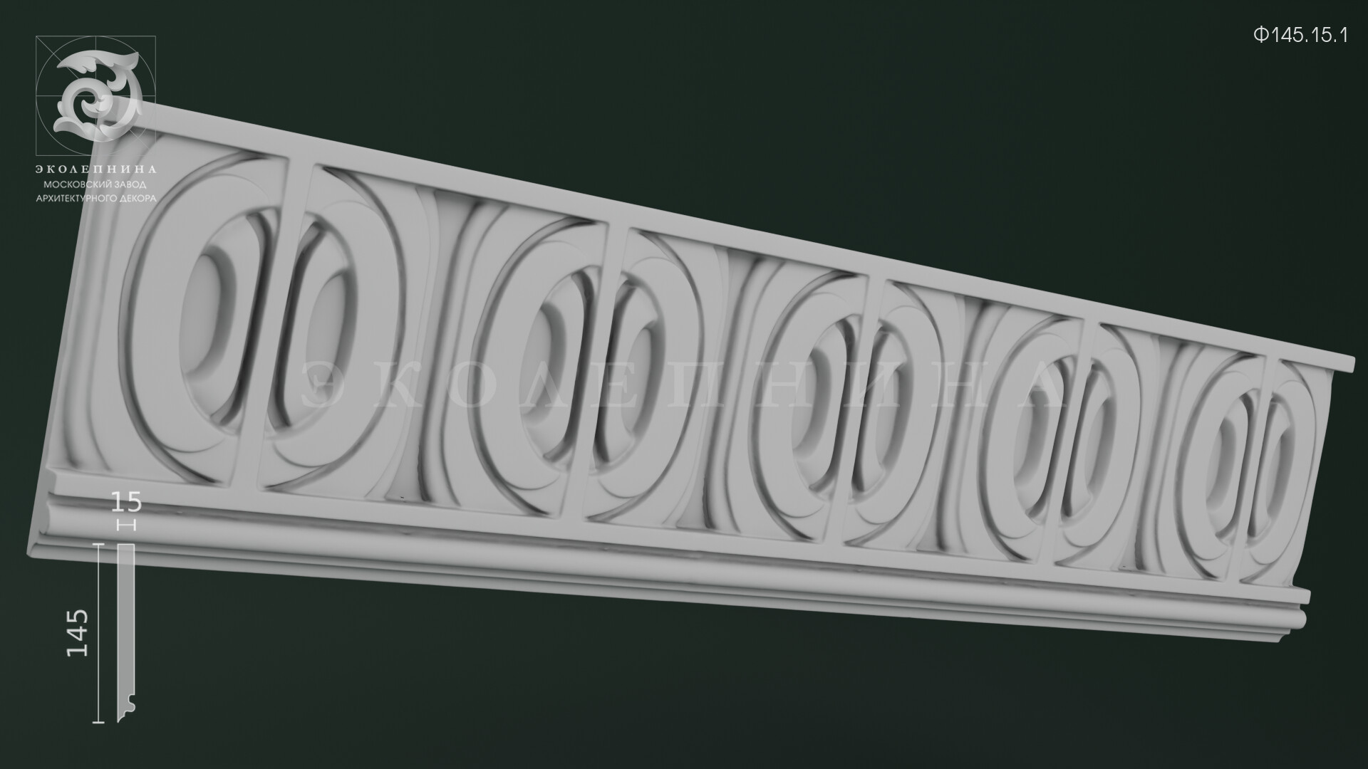 Гипсовый фриз Ф145.15.1 построен на строгой геометрии повторяющихся овальных колец, вписанных в прямоугольные секции. Тонкие вертикальные перемычки задают четкий ритм, а многоплановый рельеф формирует выразительную светотень на дугах и внутренних кромках. Чистая отливка из скульптурного гипса Г-16 подчеркивает графичность линий и аккуратность контуров ленточного орнамента.
