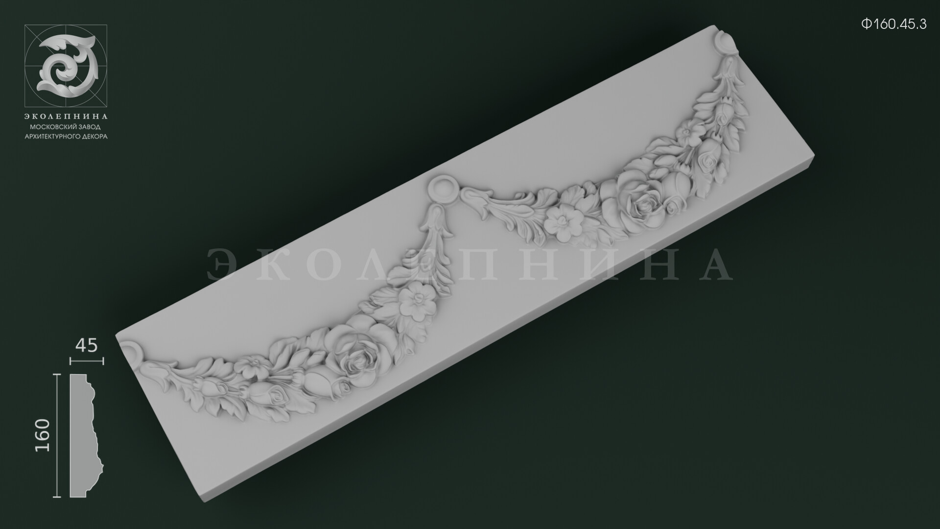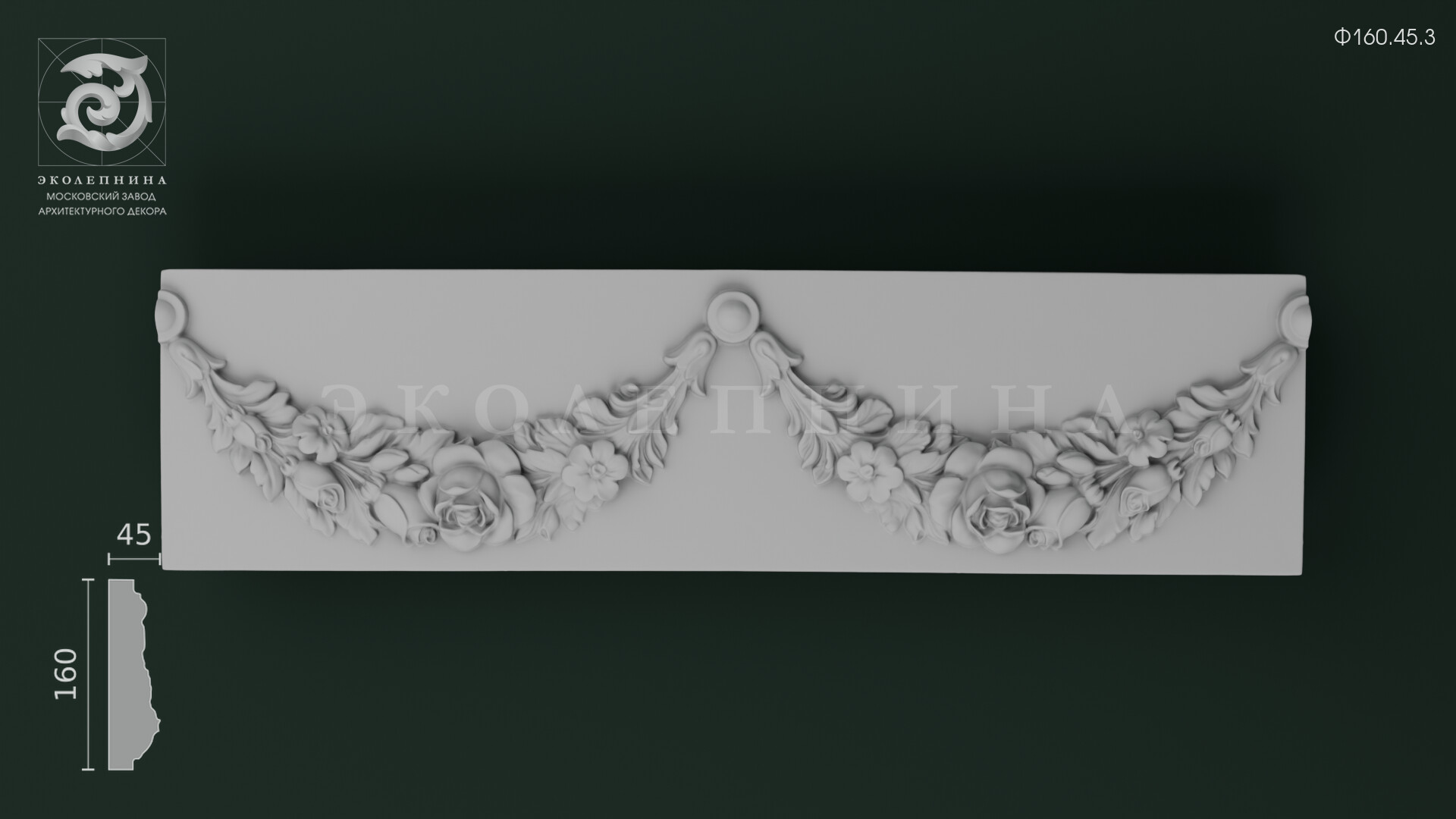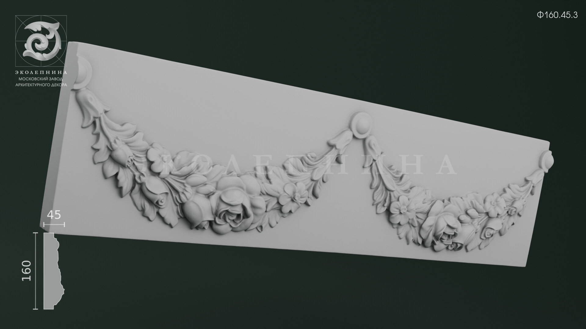 Гипсовый фриз Ф160.45.3 — изысканный фризовый пояс с пластичным флоральным мотивом: ниспадающая гирлянда из роз, бутонов и листвы образует волнообразный силуэт с выразительными «подвесами» и аккуратными розетками по краям. Ленточный орнамент построен на глубоком рельефе: лепестки раскрываются мягкими планами, прожилки листьев читаются чисто, а тонкие поднутрения дают богатую игру светотени. Отливка выполнена из скульптурного гипса Г-16, что обеспечивает четкость граней и благородную матовую фактуру.