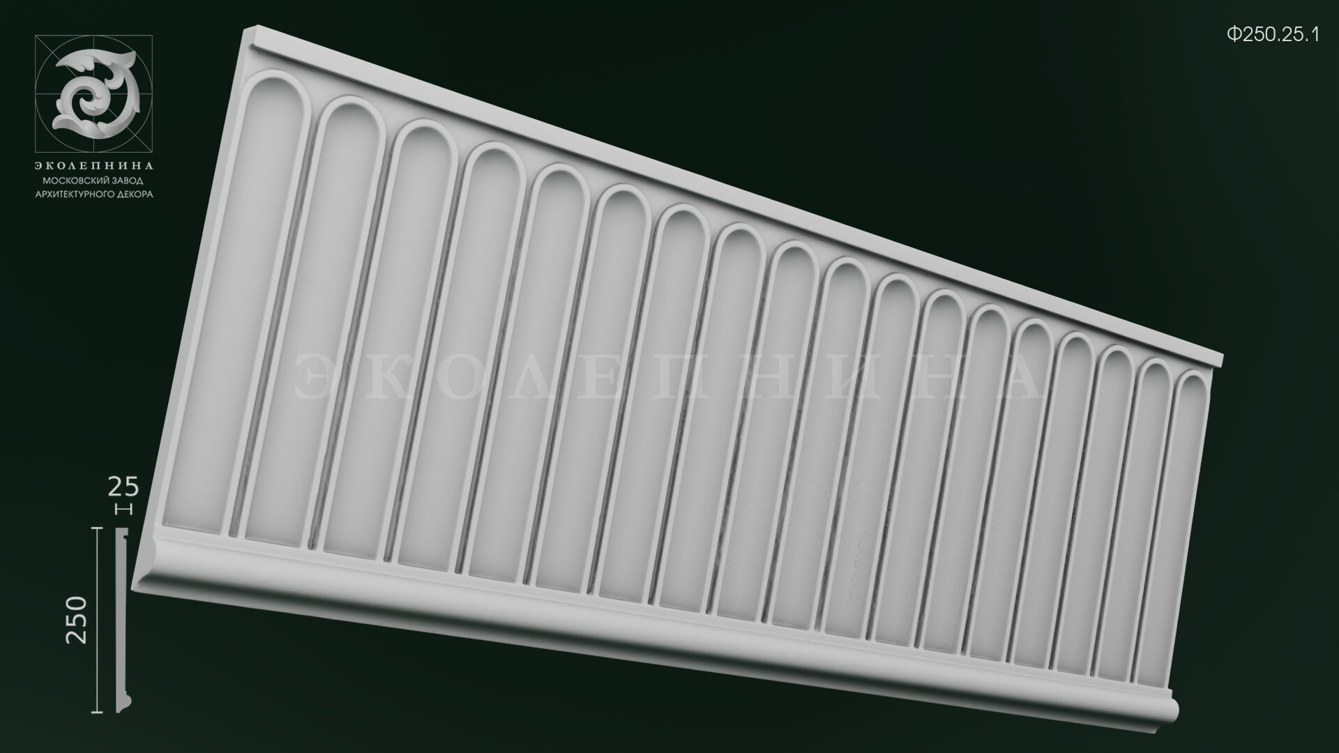 Гипсовый фриз Ф250.25.1 построен на строгом каннелированном рисунке: ряд вытянутых вертикалей с мягко закруглёнными верхами формирует спокойный, «архитектурный» ритм. Глубокие желобки создают выразимую игру светотени, а чётко выведенный рельеф подчёркивает геометрию ленточного орнамента. Отливка выполнена из скульптурного гипса Г-16, благодаря чему пластика выглядит чисто и благородно, без визуальной рыхлости.