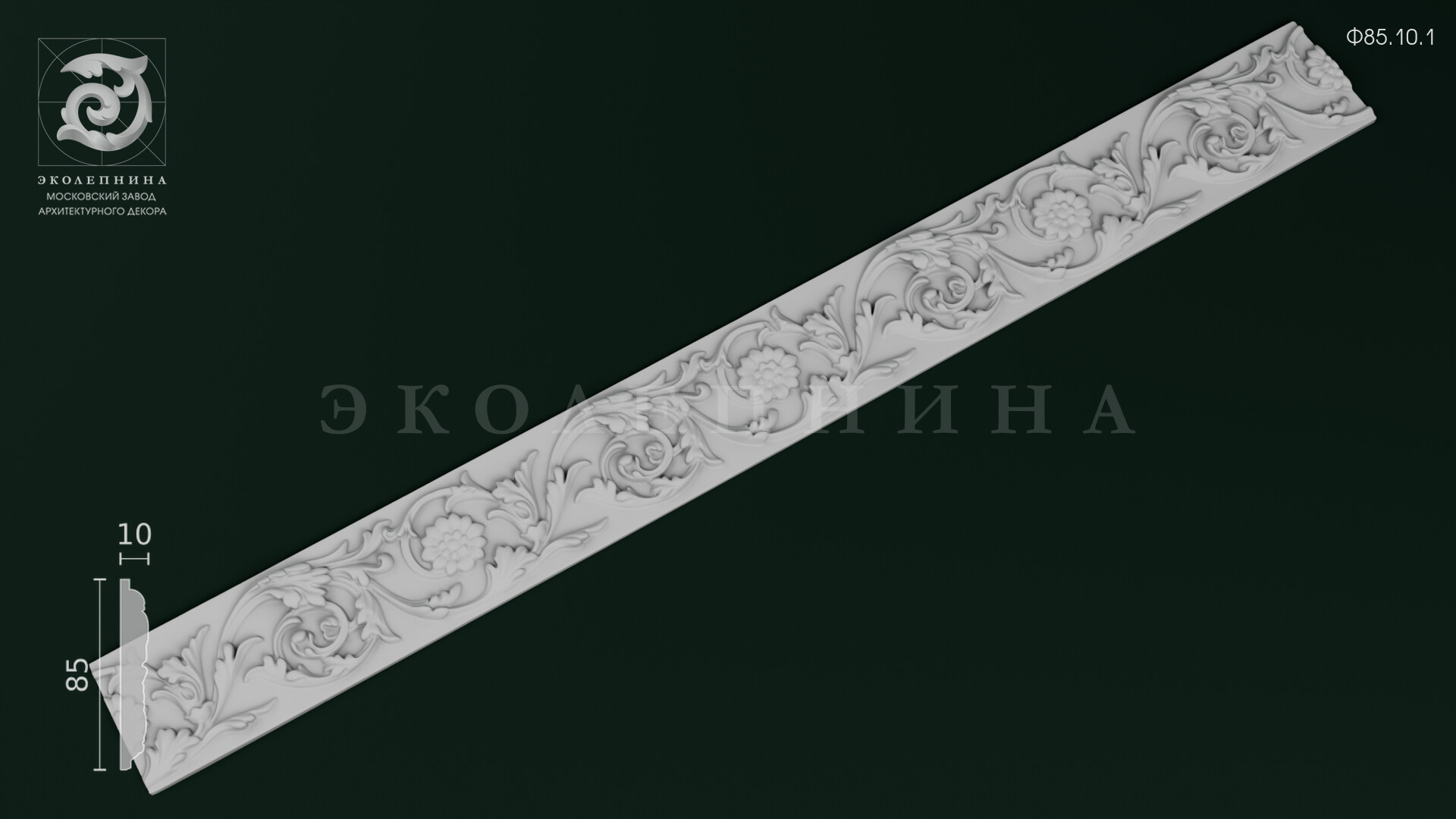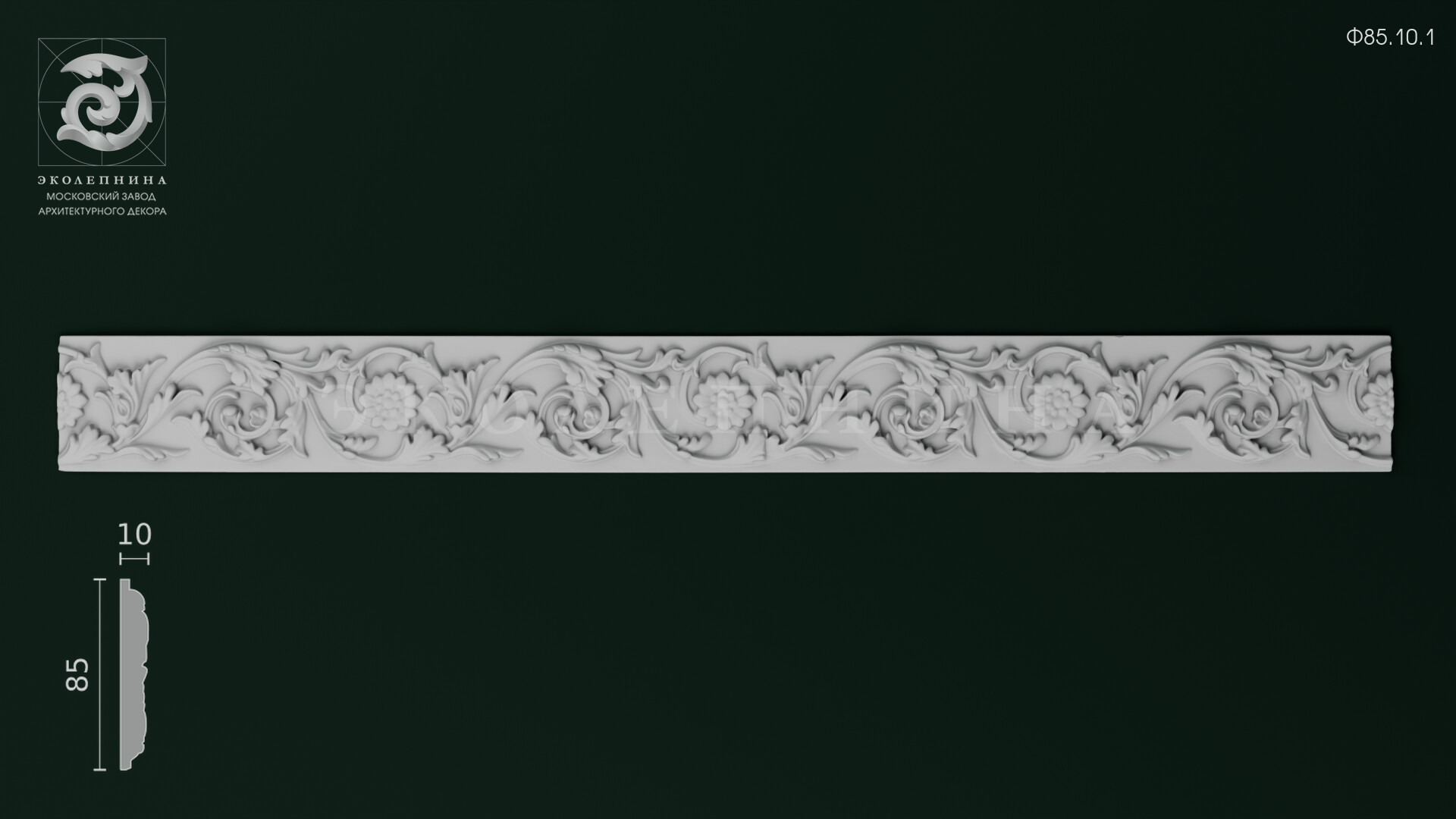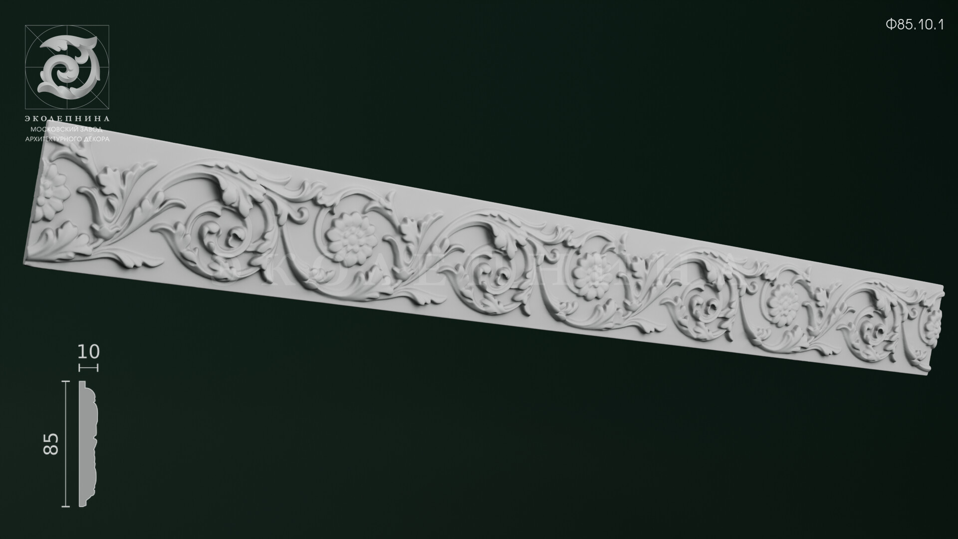 Гипсовый фриз Ф85.10.1 — выразительная архитектурная тяга с богатой пластикой: непрерывный ленточный орнамент построен на чередовании акантовых листьев, завитков и стилизованных цветочных розеток. Глубокий рельеф с мягкими поднутрениями дает благородную игру светотени, подчеркивая скульптурность формы. Отливка из скульптурного гипса Г-16 обеспечивает четкость контуров и чистоту рисунка, а повторяемый раппорт сохраняет цельность композиции по всей длине фриза.