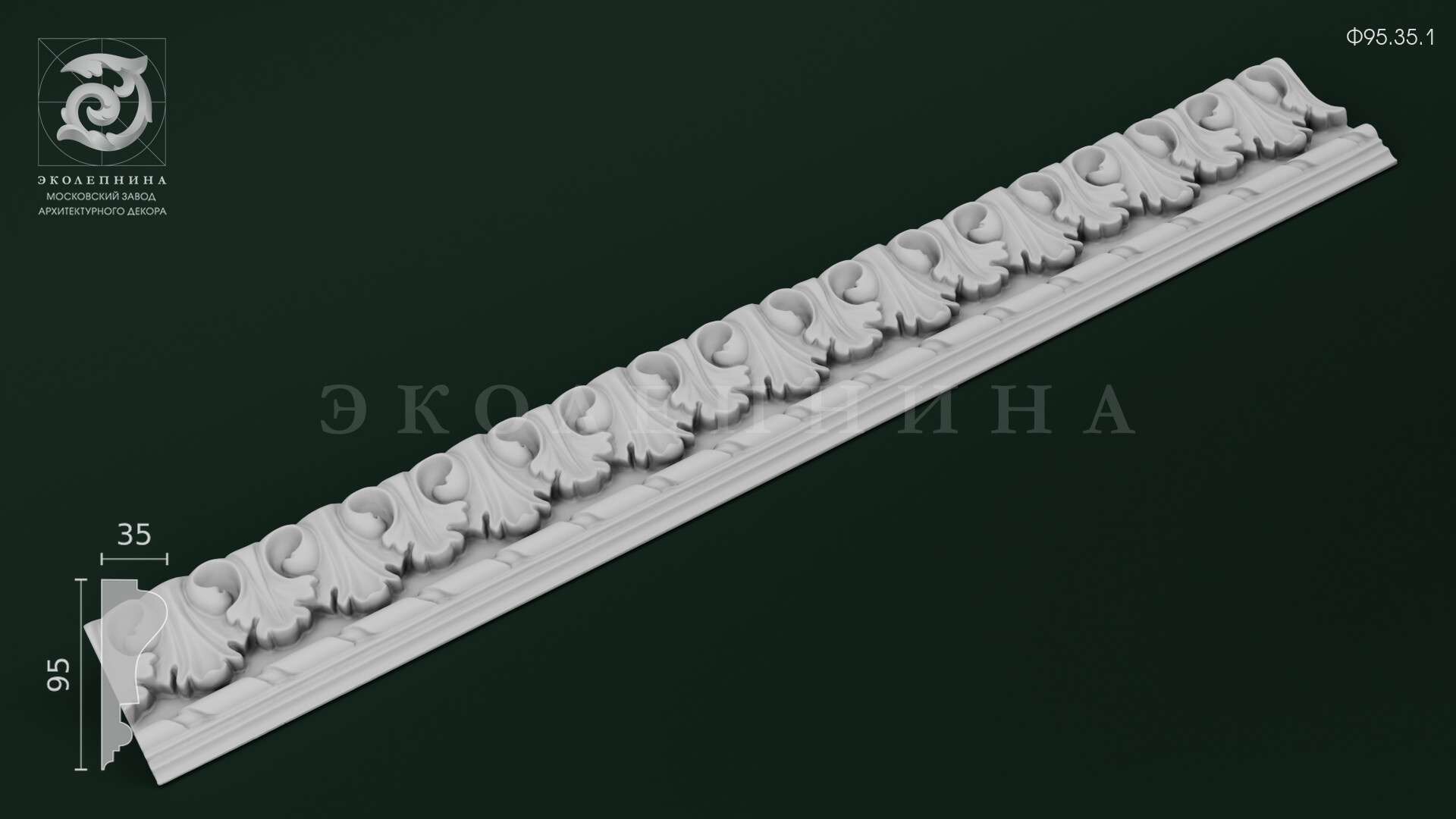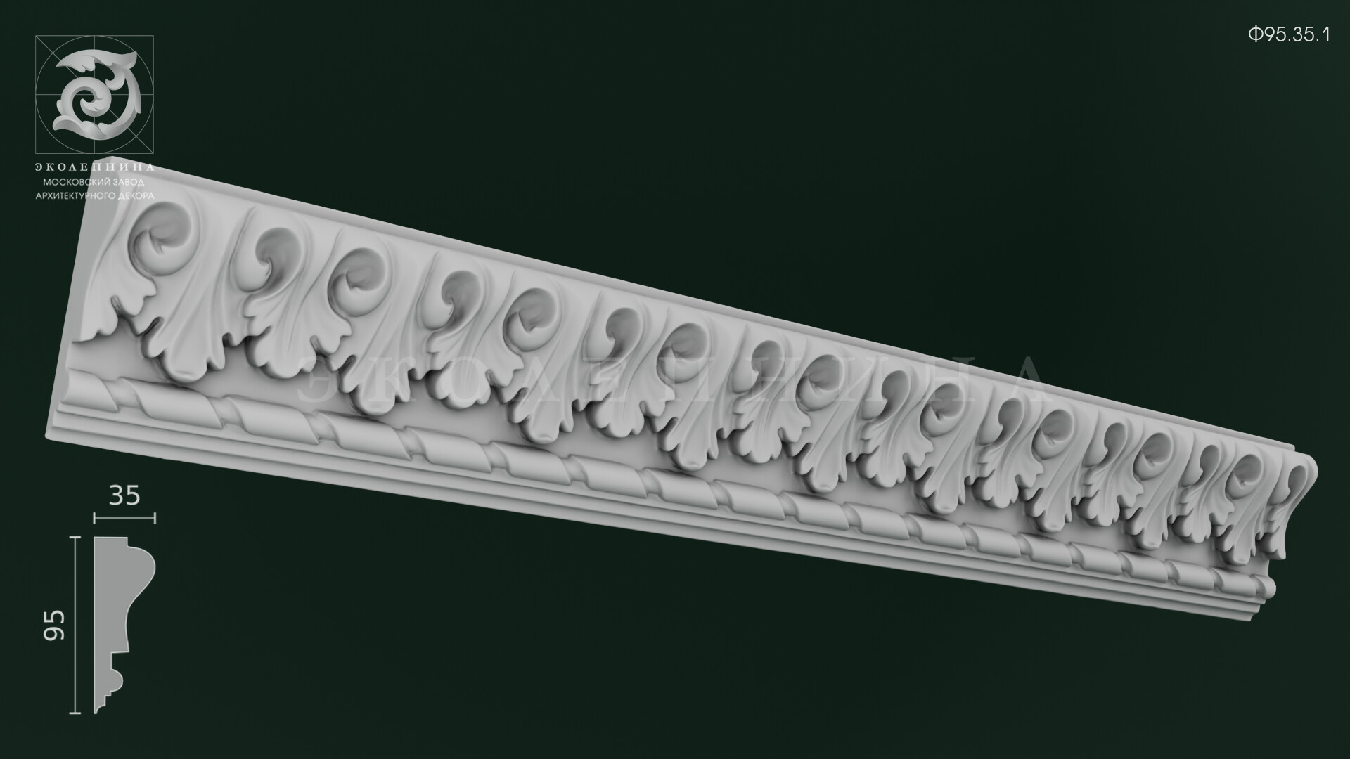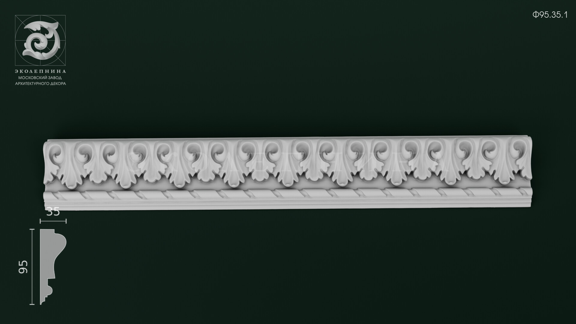 Гипсовый фриз Ф95.35.1 — выразительная архитектурная тяга с непрерывным ленточным орнаментом на основе аканта. Рельеф построен на повторяющихся завитках и пластичных листьях с мягкими поднутрениями: светотень собирается в углублениях, подчеркивая скульптурную моделировку и ритм раппорта. Отливка из скульптурного гипса Г-16 обеспечивает четкость кромок, чистоту деталей и благородную «каменную» графику.