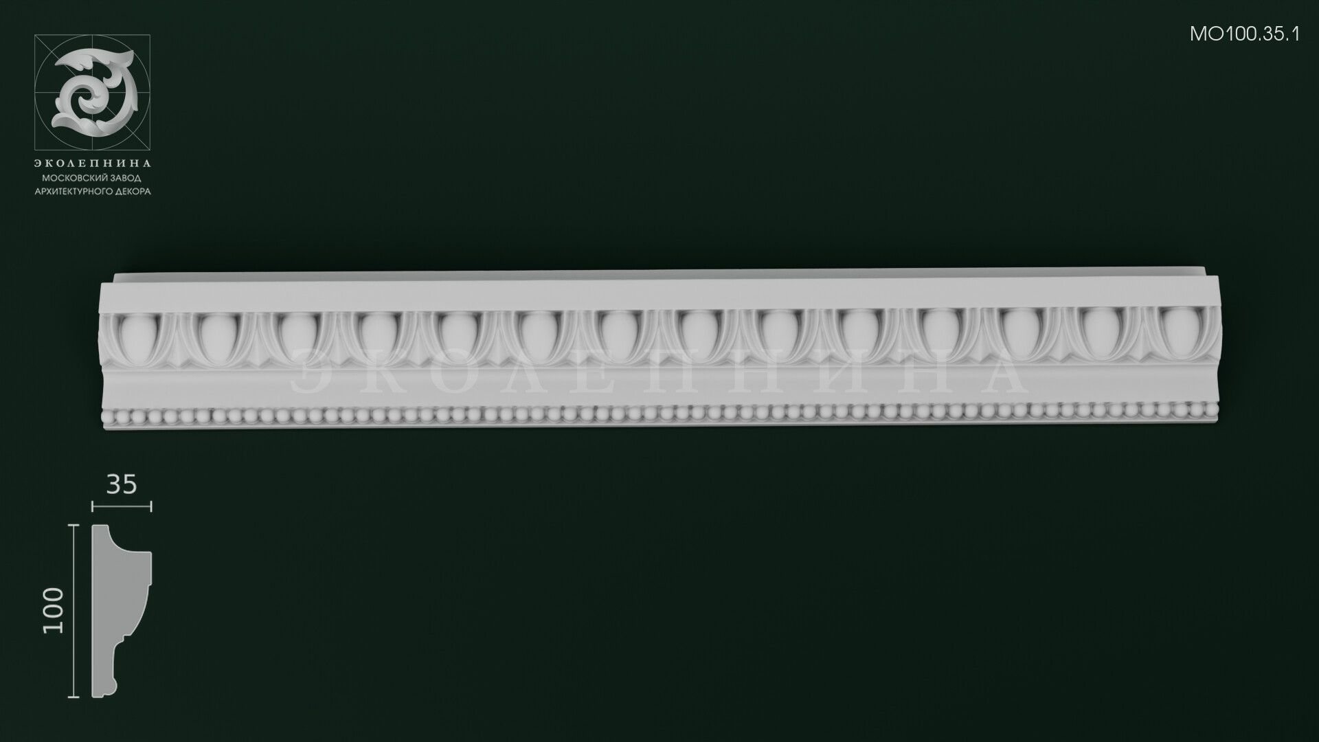 Молдинг гипсовый с орнаментом МО100.35.1 — образец выверенной классики, где рельефный декор строится на античном чередовании овоидов (ов) и тонкой нитки «бус». Пластика орнамента звучит торжественно и дисциплинированно: гладкие овалы читаются как ритм, а нижний ряд бусин добавляет ювелирную фактуру, усиливая ощущение дорогой художественной лепки. Высокий рельеф создает богатую игру теней при боковом освещении, благодаря чему молдинг словно оживает и мягко моделирует плоскость стены.