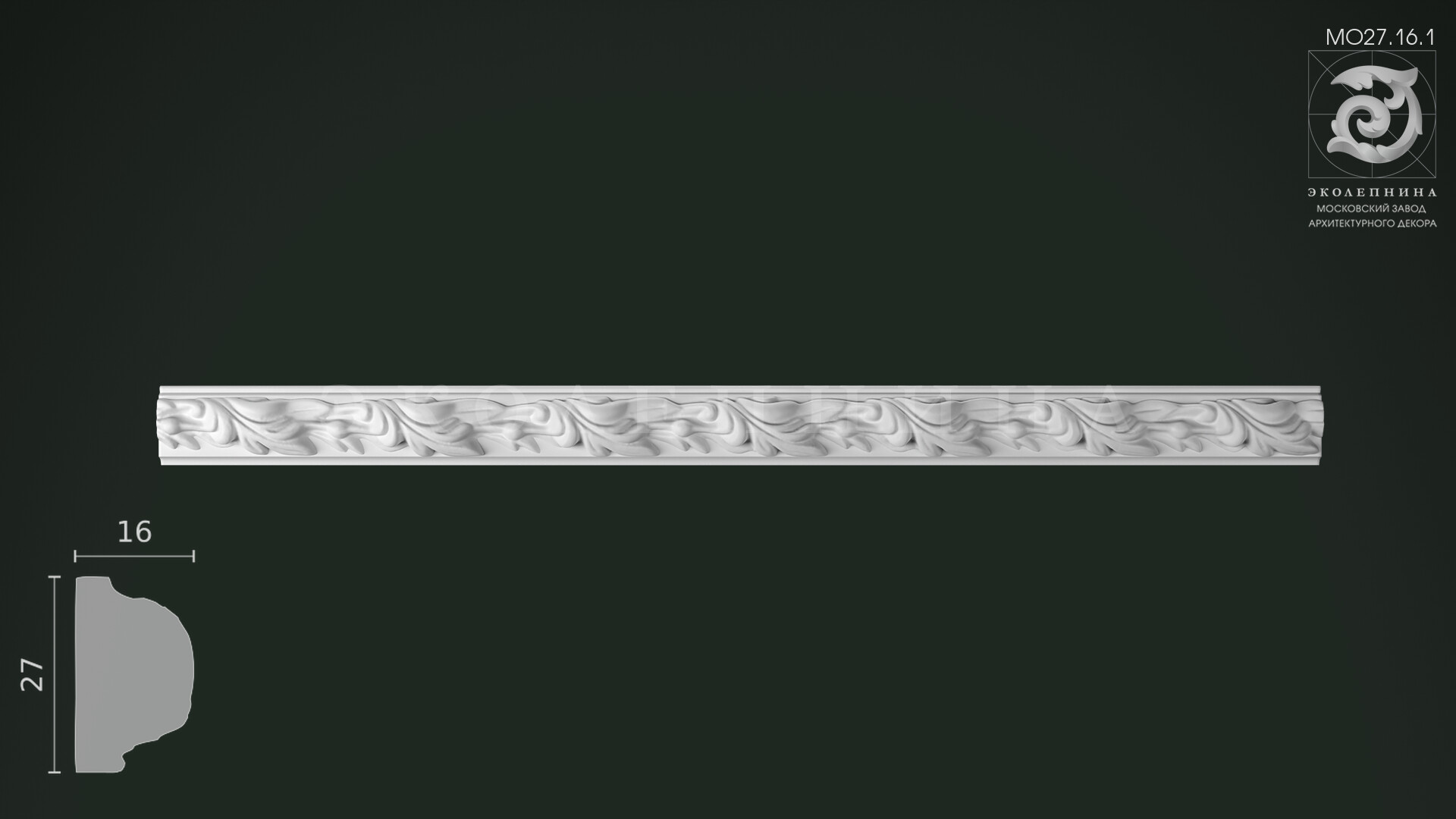 Молдинг гипсовый с орнаментом МО27.16.1 — это рельефный декор с выразительной флористикой, где мягкие завитки листвы словно развернуты ветром и выстроены в благородный непрерывный фриз. Живая пластика рисунка сочетает ажурность и читаемую глубину: высокий рельеф создает богатую игру теней при боковом освещении, усиливая объем и «дорогую» графику художественной лепки.