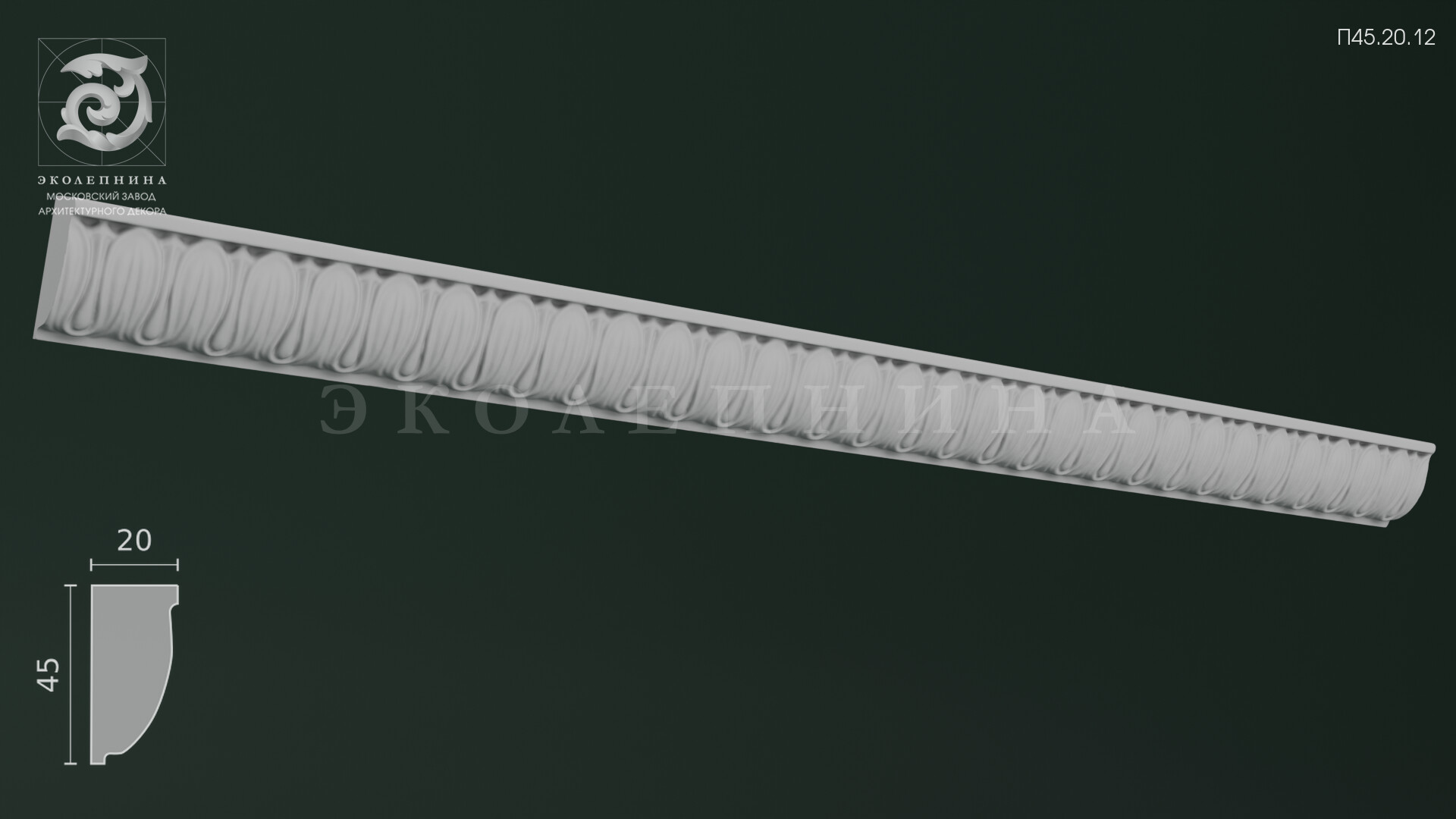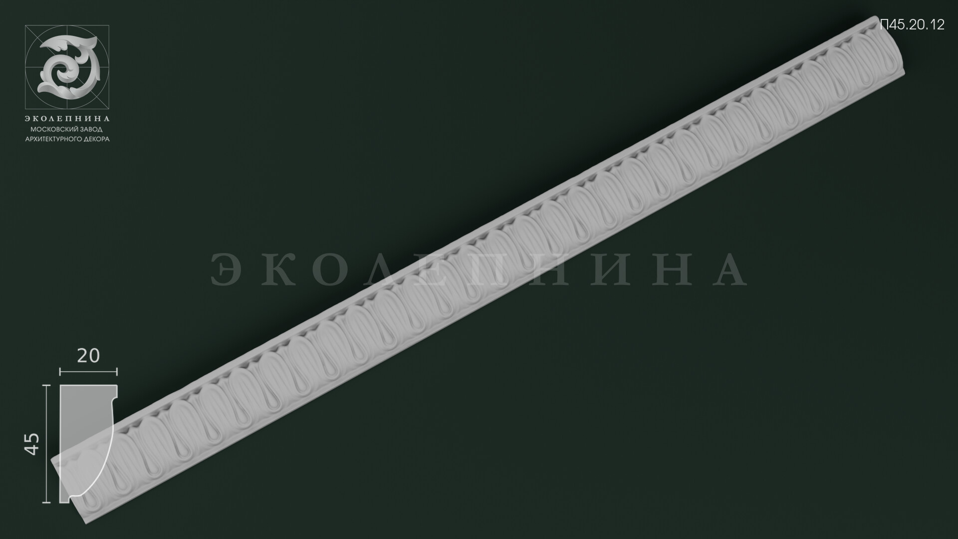 Гипсовая порезка П45.20.12 — изящная орнаментальная тяга из скульптурного гипса Г-16, работающая как ювелирное украшение интерьера. Мотив «ионики (овы)» задаёт классический античный строй: строгая симметрия, торжественный ритм и выверенный раппорт, который дисциплинирует плоскость и подчёркивает пропорции. Чёткость каждого элемента раппорта сохраняет чистоту рисунка без «замыливания», свойственного дешевым аналогам; аккуратная детализация рельефа читается и при боковом, и при верхнем освещении.