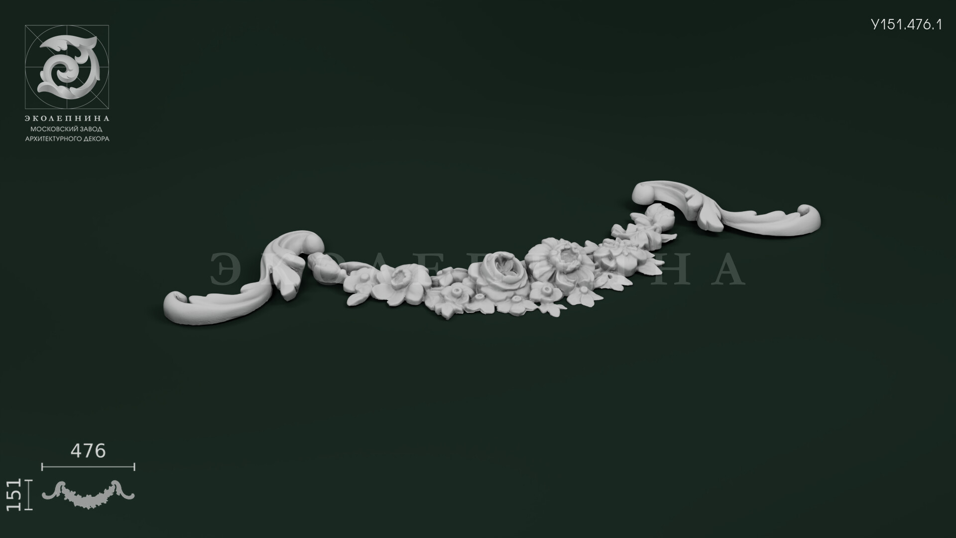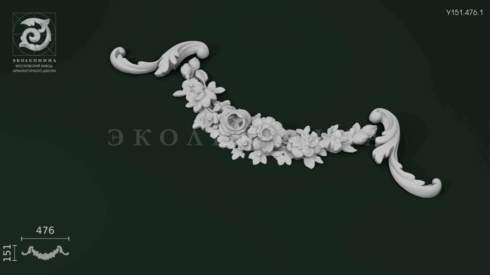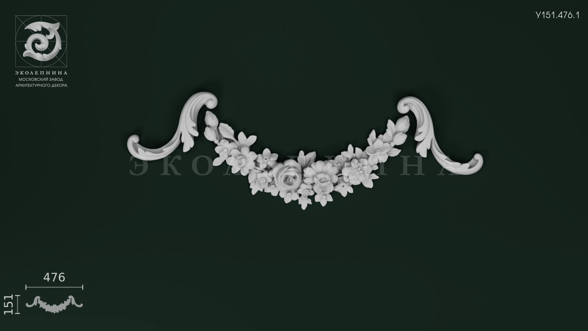 Ажурный орнамент У151.476.1 выполнен как легкий накладной элемент без подложки: композиция построена на изящной гирлянде цветов с центральной розеткой и ритмом лепестков, дополненных симметричными рококо — причудливая форма, напоминающая раковину или завиток морской волны. Асимметрично, дерзко и очень изысканно." style="cursor: help;">рокайльными завитками по краям. Такой лепной декор дает выразительную художественную пластику и формирует центральный акцент, не перегружая плоскость.