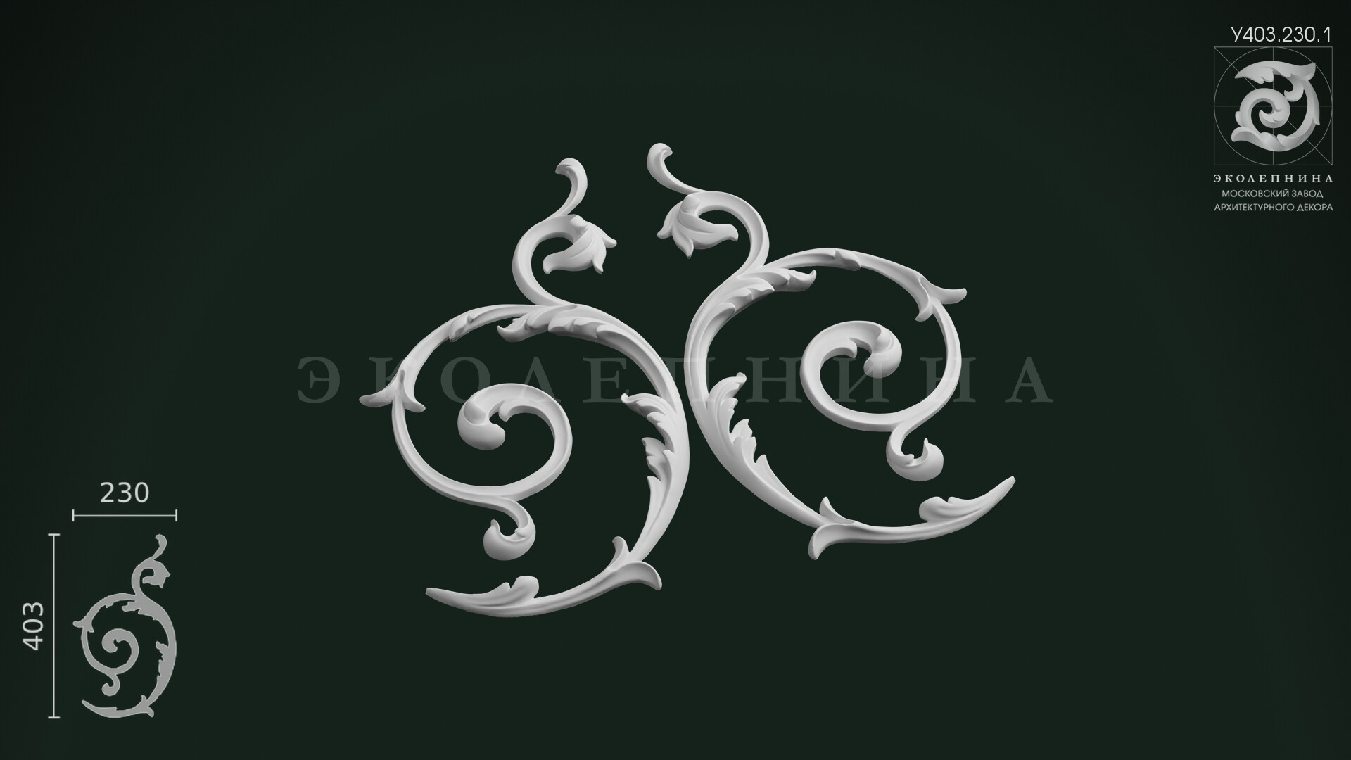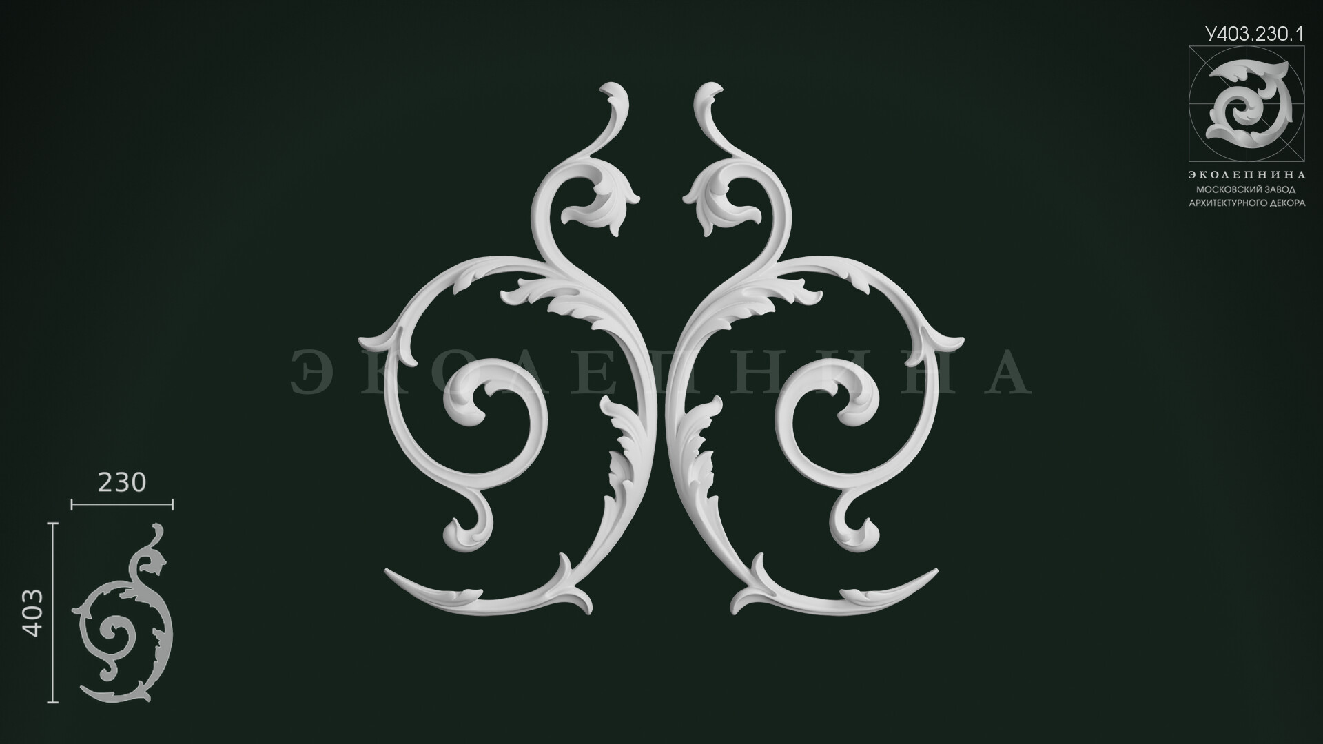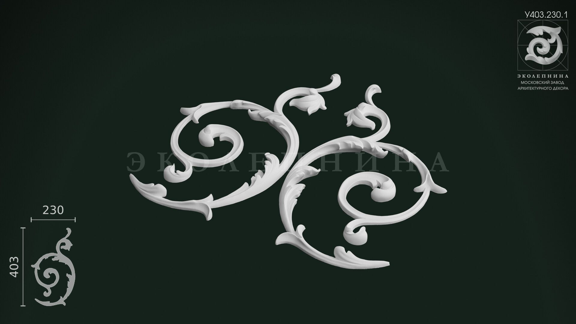 У403.230.1 превращает геометрию стен и периметра потолка в завершённую декоративную композицию, где каждая линия звучит как часть классического орнамента. Для идеального результата стоит подобрать молдинг соответствующей ширины и профиля из коллекции завода «ЭКОЛЕПНИНА» — так рамка будет выглядеть цельной, выверенной и по-настоящему архитектурной.